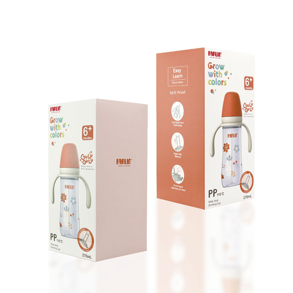 A spill-proof and safe cup with a transparent body and peach lid. Designed with a soft silicone straw for gentle sipping. Features ergonomic handles for an easy baby grip and a hygienic sliding lid to keep the straw clean. Made from BPA-free, heat-resistant (110 °C) PP material.
