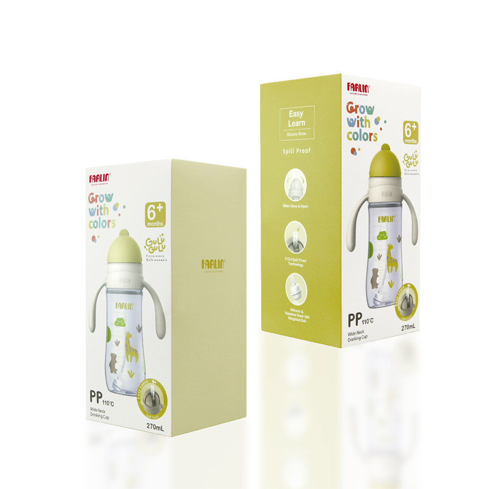 A safe and spill-proof cup with a transparent body and white & cute yellow cap. Features a weighted straw ball for drinking at any angle, ergonomic handles for easy grip, and a hygienic sliding lid to keep the straw clean. Made from BPA-free, heat-resistant (110 °C) PP material.
